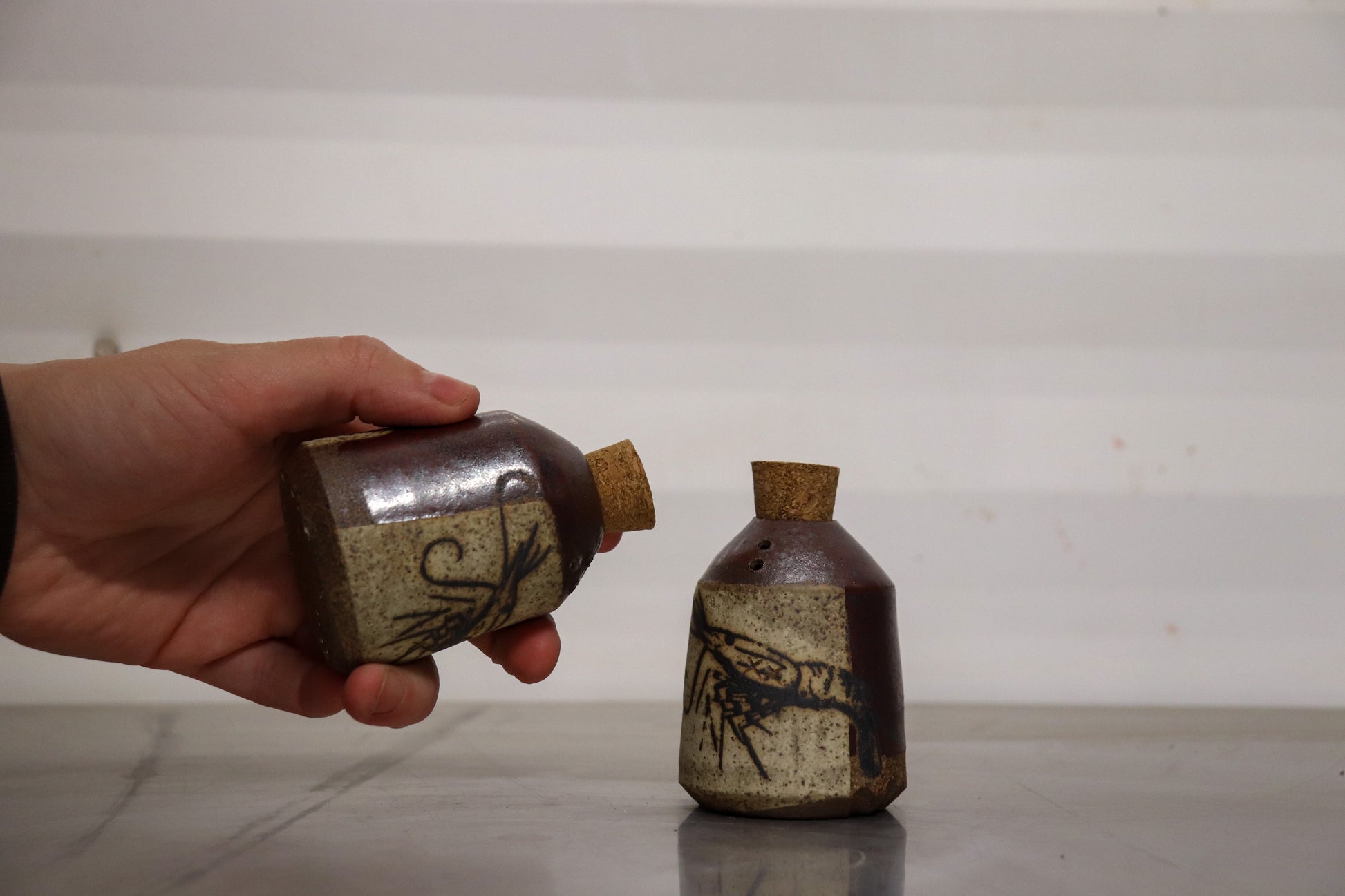 The faceted form feels good in the hand, with a comfortable weight that keeps them stable on the table. Cork stoppers on the base allow for easy refilling and add a warm, organic detail that complements the raw, utilitarian character of the ceramics.